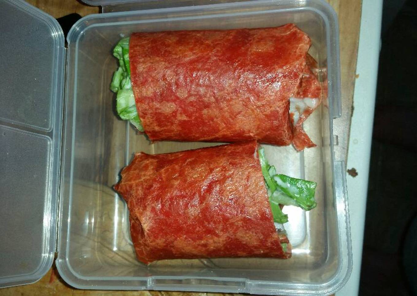 - Finally roll the wrap and cut it into two sections. Place the sections - facing opposite directions into the container. Then taking a knife, slice your fruit and place into one of the compartments in the lunchable. When this is done - all you have to do is place the final touch- your sweet into your container.