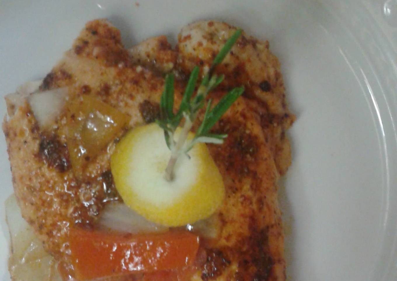 - 1 Tbsp of olive oil in pot, two 1/2 inch thick chicken breast, 1 Tbsp Tajin seasoning for each breast crusted on, cover and cook on medium fire for ten minutes then flip over, cook for another 10 minutes. Last 3 minutes add vegetables, 1 diced up romaine tomato, 5 diced up shallots green onions, half of freshly squeezed lemon, dress with lemon peel and piece of rosemary.